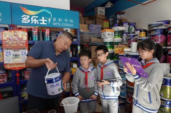 为了寻找更专业的方法,我们带着学生实地考察了一家油漆店。老板热情地接待了我们,当听到我们的问题后,老板耐心地讲解,这些老建筑的修复需要用专门的油漆,而且要根据不同的材质选择不同的油漆,挑选想要的颜色。老板还现场教刷油漆的正确方法。学生们听得津津有味,不时提出问题。