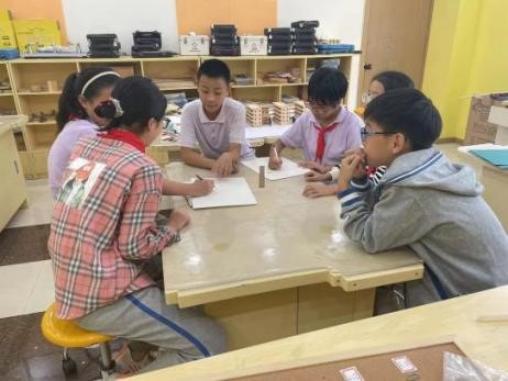 接着,学生们深入老街去测量门板大小,计算平方。他们拿着尺子,认真地测量着每一扇门的尺寸,还在本子上记录下来。回到课堂后,学生们开始进行热烈的讨论。他们考虑油漆用量、天气状况、小组分工情况及其他因素。